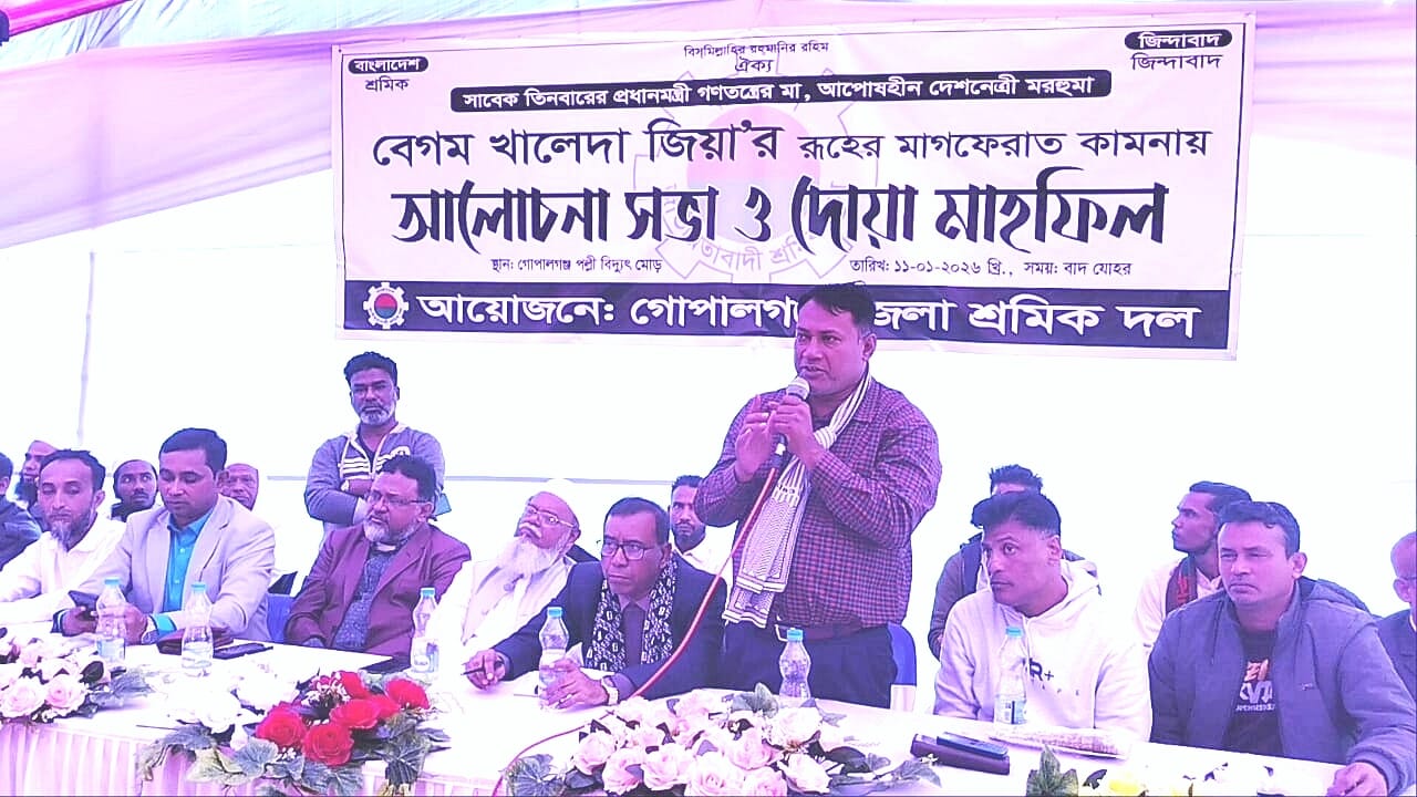 “দেশনেত্রীর আদর্শই আমাদের এগিয়ে চলার প্রেরণা” — ডা. কে এম বাবর গোপালগঞ্জে সাবেক প্রধানমন্ত্রী ও বিএনপি চেয়ারপারসন বেগম খালেদা জিয়ার রুহের মাগফিরাত কামনায় আলোচনা সভা ও দোয়া মাহফিল অনুষ্ঠিত হয়েছে। রবিবার বিকেলে গোপালগঞ্জ পল্লী বিদ্যুৎ মোড় এলাকায় জেলা শ্রমিক দলের উদ্যোগে এ কর্মসূচির আয়োজন করা হয়।