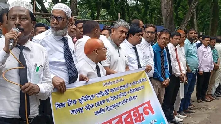 জয়পুরহাটে অবৈধ দোকান ঘর নির্মাণ ও বহিরাগত বিচারককে হুমকির প্রতিবাদে মানববন্ধন
