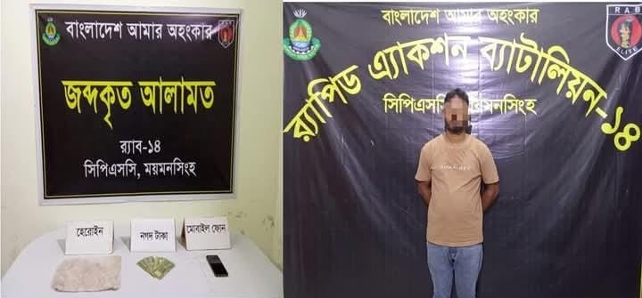 ময়মনসিংহ জেলার ভালুকা থানা এলাকায় অভিযান চালিয়ে ২৬০ গ্রাম হেরোইনসহ একজন মাদক কারবারিকে গ্রেপ্তার করেছে র্যাব-১৪, ময়মনসিংহ-এর সিপিএসসি কোম্পানির একটি আভিযানিক দল।