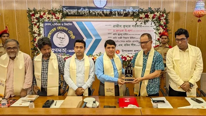 বাংলা সাহিত্যের বিশিষ্ট প্রবন্ধকার ও মুক্তচিন্তার অগ্রদূত মোতাহের হোসেন চৌধুরীর স্মরণ সভা উপলক্ষ্যে লেখকপূত্র ক্যাপ্টেন সৈয়দ জাহীদ হোসাইনের হাতে মরণোত্তর সম্মাননা সারক তুলে দেন লক্ষ্মীপুর জেলা প্রশাসক রাজীব কুমার সরকার।