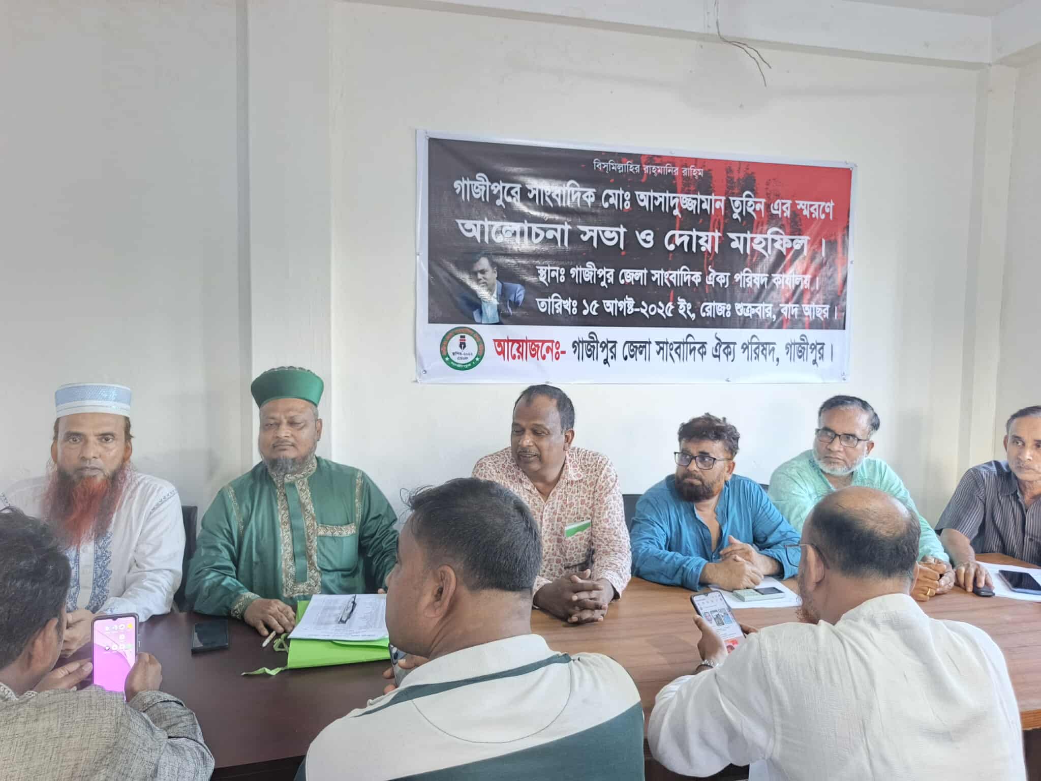 শুক্রবার (১৫ আগস্ট ২০২৫ইং) বাদ আছর জয়দেবপুর রোড (বাসন থানা বিপরীতে) গাজীপুর জেলা সাংবাদিক ঐক্য পরিষদের প্রধান কার্যালয়ে এই স্মরণ সভা ও দোয়া মাহফিল অনুষ্ঠিত হয়েছে।
